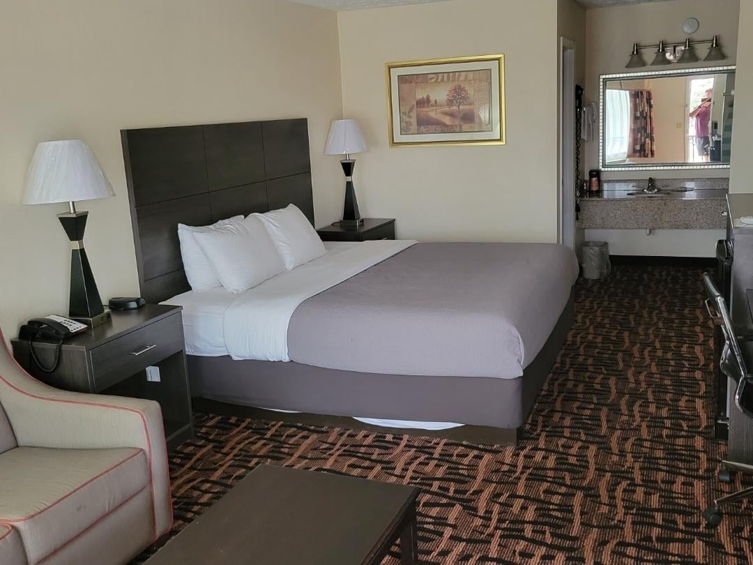 Oh boy… I really hope this doesn’t make me sound spoiled compared to the other reviewers who have stayed here. I feel like most people who write lengthy reviews usually had something specific happen to them, so bear with me. This hotel area is fine. Dahlonega is a quiet town. It’s easy to get in and out of. Front parking is minimal. There is plenty of parking in the back but what is unfortunately about having a room in the front but parking in the back, their elevator is broken. So we had to climb 4 flights of stairs in the back but only 2 flights in the front of the building. The rooms need redone. Badly. Very outdated. Shower head with weak water pressure, the water from the sink with spider, dirt in the corners of door frames, and stains on towels. Cleanliness was manageable to an extent I guess. Except for the dead stink bug in the corner. This is where the specific concern comes into play. When we checked in, she gave us the wrong room number. Luckily no one was there but the room hadn’t been cleaned, beds undone. Out of all the jobs that are required of a hotel, a fresh and correct room is the first of their job. Leaving us with a terrible impression from the start. I thought the bed was ok, but some of my family woke up feeling uncomfortable. No padding on the mattress at all. The chairs were fine. I didn’t want to sit in the fabric chair. Tv was fine. The screen was dark and we couldn’t adjust it. I didn’t try any of the other items. not great but not bad.
