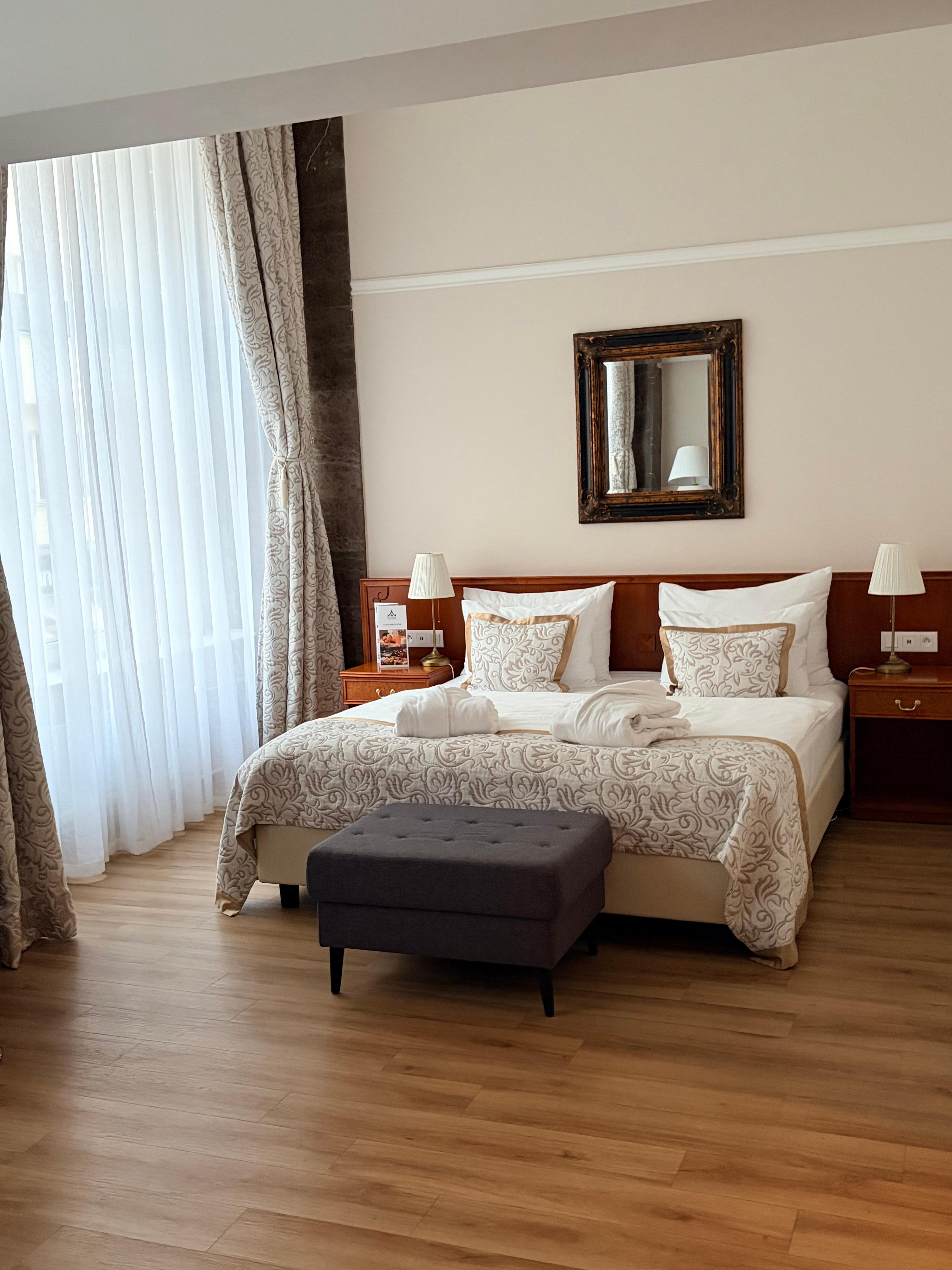 Hotel antigo. Quarto pequeno com chão de taco. Instalações antigas, mas confortável. Localização poderia ser melhor. Bom café da manhã.