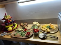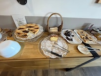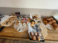 Le petit déjeuner est servi sous forme de buffet avec des produits frais et gâteaux fait maison. Aussi jus d’orange pressé!