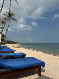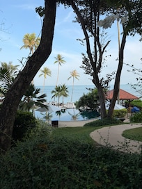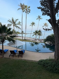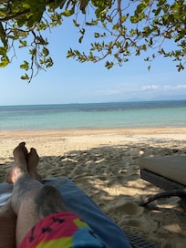 Wie oft in Bewertungen erwähnt sehr schöne und ruhige Lage an Privatstrand mit immer freien Liegen. Strandhandtücher aber teils fleckig. Es ist aber schon alles sehr alt. Unsere Sea View Villa war schlecht isoliert und die Klimaanlage sehr laut und wenig effektiv. Wenn man sie, nachdem sie stundenlang eingeschaltet war, beim Betreten des Zimmers aufgrund der Lautstärke ausgeschaltet hat, war es bereits nach wenigen Minuten wieder stickig heiß. Dementsprechend schlechte Schlafqualität. Wir haben dies reklamiert, sie wurde gecheckt und es wäre alles in Ordnung. Als Entschädigung bekamen wir eine Flasche Wein. Das war nett, aber eine Klimaanlage, die der Preisklasse und einem 5-Sterne-Hotel gerecht wird, wäre uns lieber gewesen. Ein Zimmerwechsel wurde uns nicht angeboten. Der Fußboden knarzt bei jedem Schritt und wenn man nachts aufsteht, ist der Partner sofort wach. Wenig Steckdosen. Es gibt keine bequeme Sitzmöglichkeit, auch auf der Terasse mit wunderschönem Ausblick nur 2 unbequeme Holzstühle (keine Liegen, keine Stühle mit Kopfstütze o.ä.). Das Gym war klein, spärlich ausgestattet und die Geräte teils defekt. Im Lai Thai Restaurant war man trotz mehrfacher Bitte nicht in der Lage uns ein nicht scharfes Fischgericht zuzubereiten. Warme Vorspeise und Hauptspeise wurden gleichzeitig serviert. Auch wenn sie Halbpension gebucht haben, müssen sie selbst für Wasser beim Abendessen 7-9 Euro pro Flasche bezahlen. 1 Flasche Wasser und 2 kleine Gläser Wein ca. 35 Euro. Das Frühstück