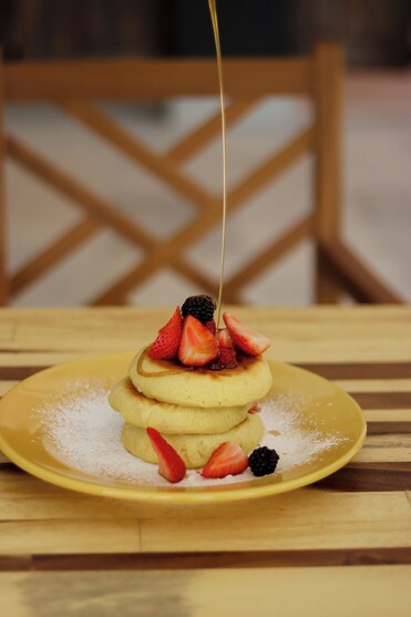 Um restaurante serve café da manhã preparado na hora com ingredientes locais. Pelo menos 80% dos alimentos vêm de fontes próximas.