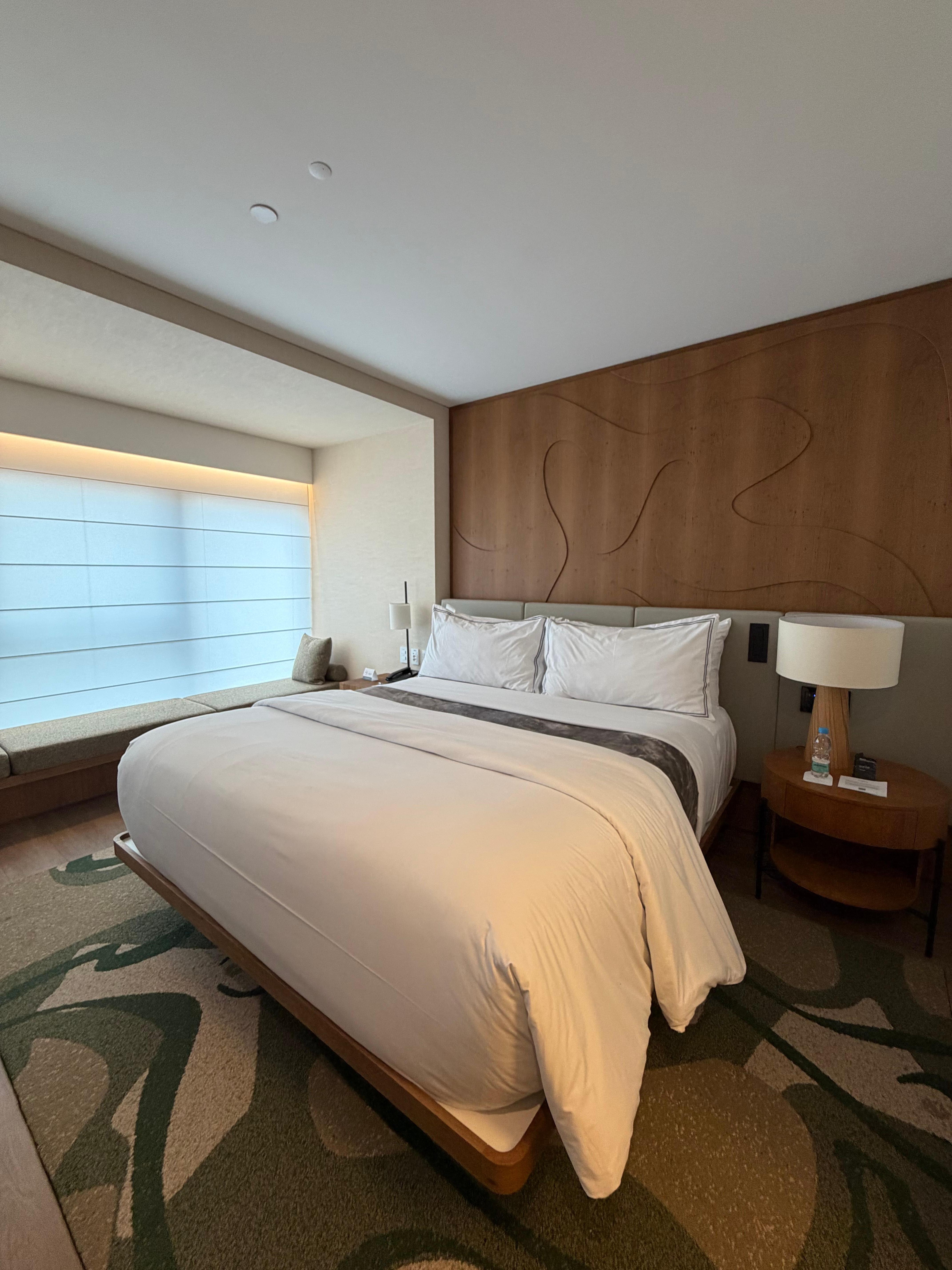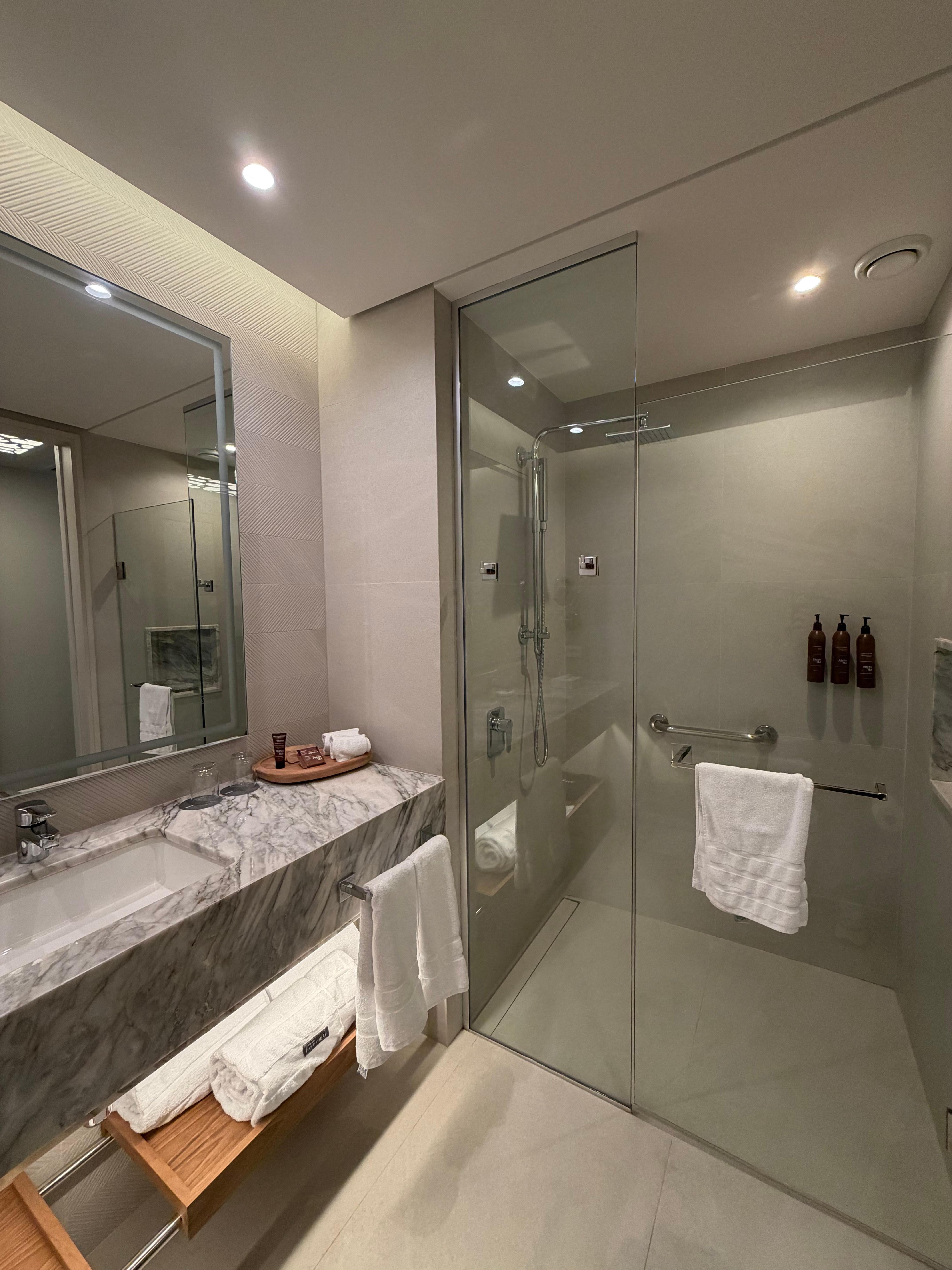 O minibar é bastante limitado e a cama, na minha opinião, poderia ser mais confortável. Um ponto que considero especialmente negativo é o sistema de entretenimento do quarto: simplesmente não é possível espelhar o celular na televisão, e o hotel tampouco oferece uma solução como Chromecast ou algo similar — algo que considero essencial em um hotel recém-inaugurado.