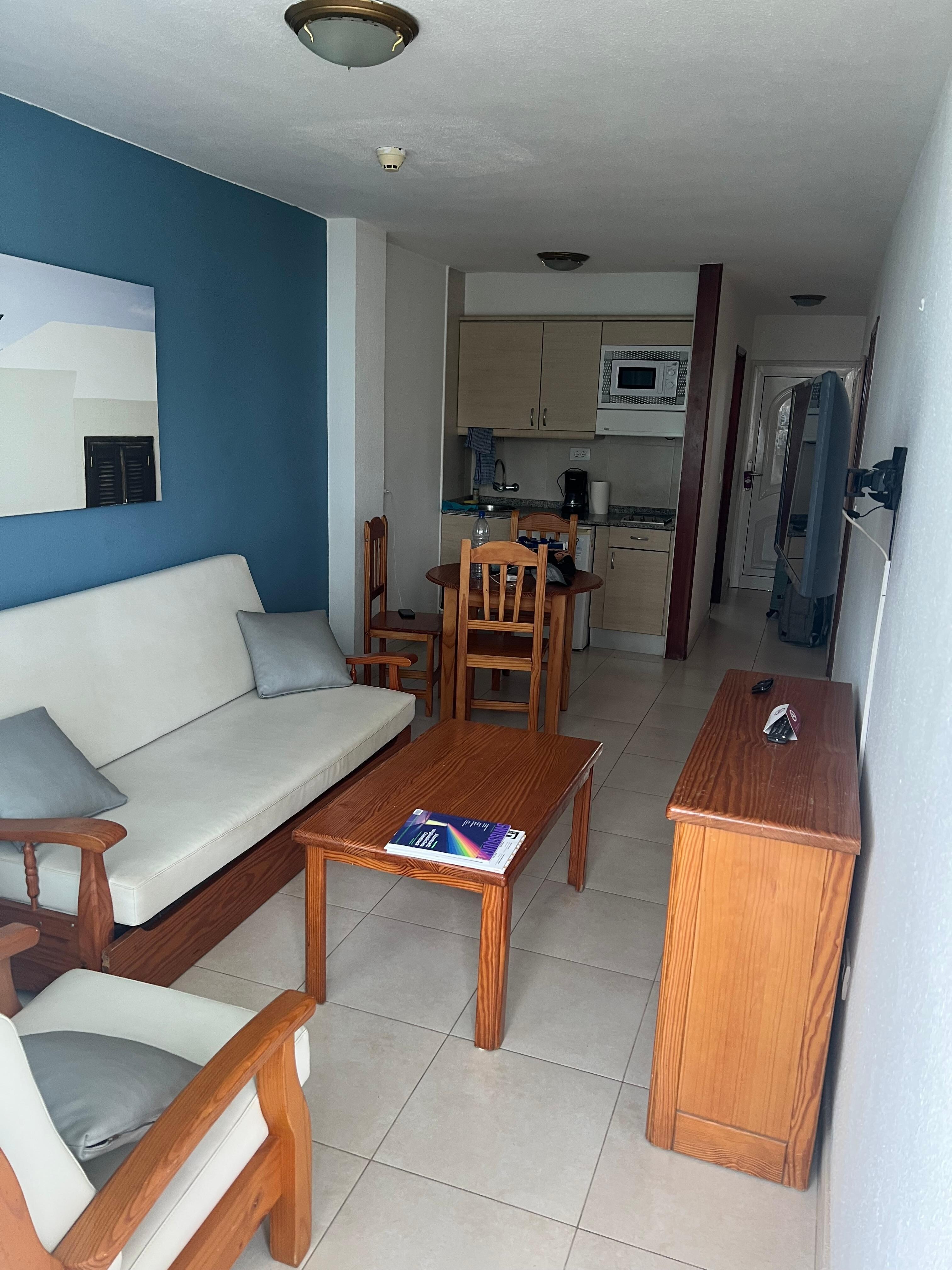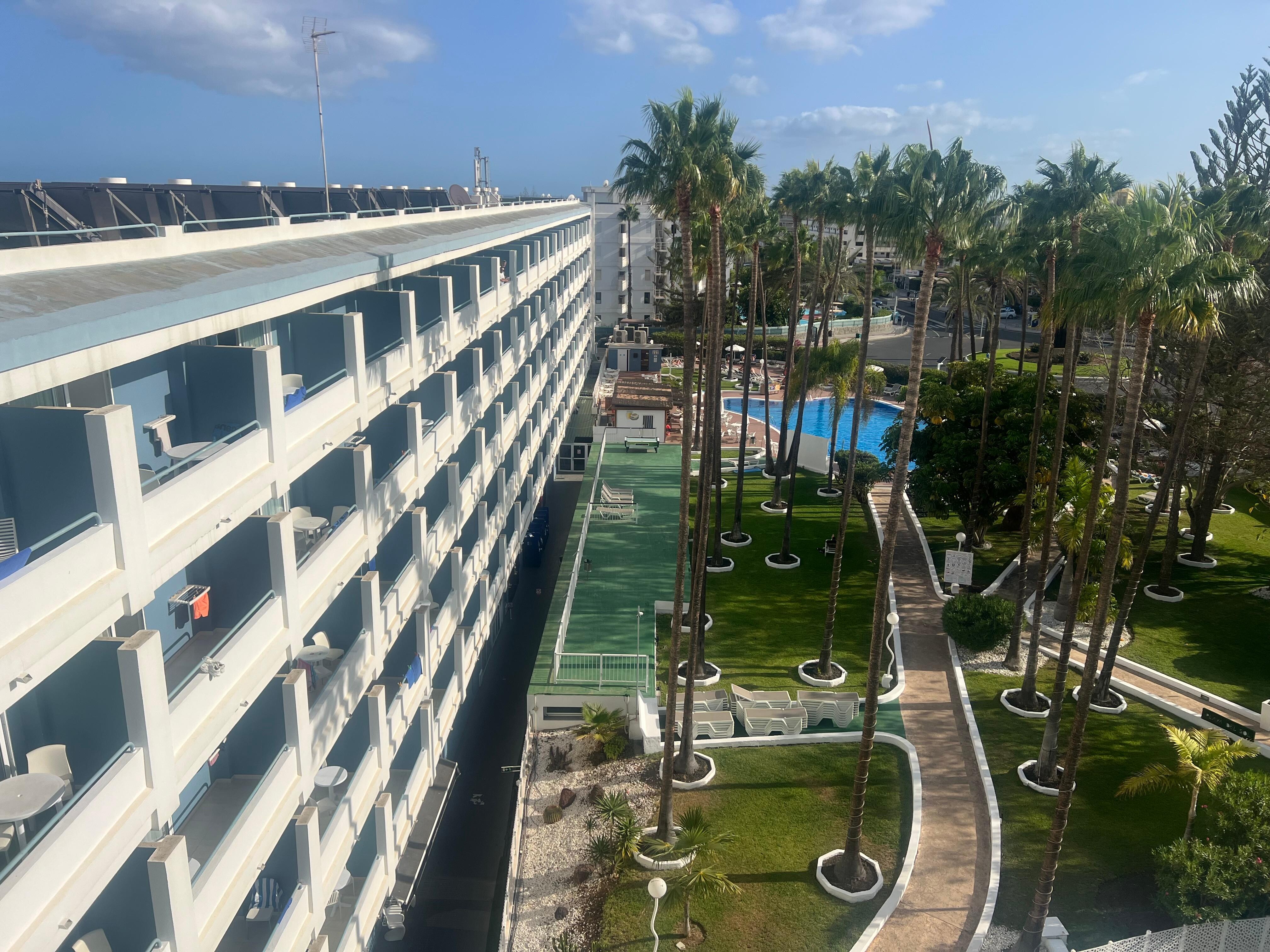 Este hotel está convenientemente situado ao lado do yumbo, para quem não sabe (foi o meu caso) o yumbo é um centro comercial com bares, discos, restaurantes e lojas inserido numa atmosfera homosexual. É muito divertido para todo o público! Mais distante fica a plaza com o divertimento dirrecionado a todo o público. A praia fica a 10min a pé! Pode seguir-se a rua do hotel e chaga-se facilmente á praia de maspalomas (onde estão as dunas) ou por atalhos entre varias ruas chega-se facilmente ás praias de playa del ingles. A recepção do hotel poderia melhorar os seus serviços ao falarem melhor ingles. A piscina é optima, disponibilizando espreguiçadeiras para todos. Quanto á limpeza, esta foi feita apenas 2 vezes durante a minha estadia de 7 noites. Este hotel não disponibiliza amenities como shampoo ou gel de banho. Não existe secador e a TV tem de ser requisitada por 4€ ao dia!! No que respeita a kitchnette, tem alguns utensilios básicos mas a esponja para depois lavarmos a louça se necessario, terá de ser comprada! no geral, este hotel foi uma boa escolha pela sua relação preço/qualidade. espero ter sido útil aos proximos visitantes!
