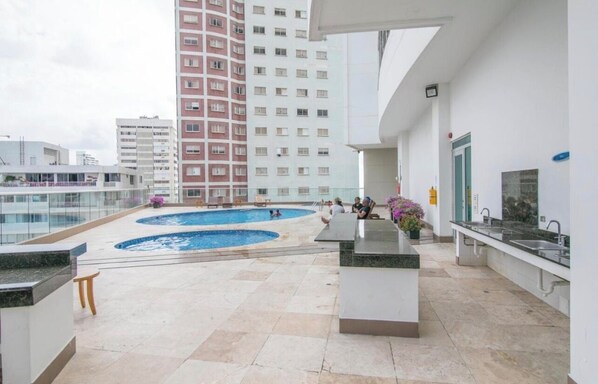 Este apartamento possui 2 piscinas externas e fica perto de Praia Bocagrande