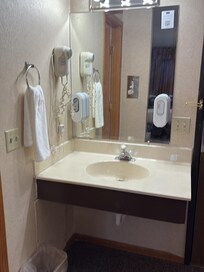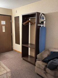 The rooms were very nice, we got the one with the jacuzzi and it was wonderful. The rooms have shower/tub, comfy linens and pillows, desk, refrigerator, microwave and coffee maker with coffee. Iron and ironing board. Pool was under maintenance but they have a cozy bar with drinks and snacks and a few slots and TV and it was actually one of our favorite parts. They have a continental breakfast that is as good as any I’ve had. Owner is incredibly friendly and welcoming. Staff is like family- so kind and authentic. The only thing I hated (and I hated it) was the dial soap and/in the dispensers you had to bang against the wall to get a squirt. If they replace all of those with good shampoo in a better dispenser it would make a huge difference. If you have a lot or large bags, request the first floor. .