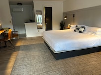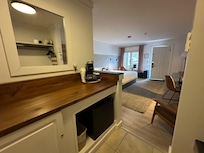 Absolutely my favorite small remodeled hotel. I loved it. There is a pantry bldg that offers free snacks, microwave & tables.The Ice house had Ice machine & W/D & has baskets with a variety of supplies if needed. Entry only by your access code. Very thoughtful added touch. The rooms don’t have a microwave, but there are microwaves in both of building at each end of the run of rooms we were in. Very convenient @ honestly keeps the sometimes strong orders out @ for safety too. Found out at checkout the section we stayed in is getting full remodel too. It truly looks like it was recently remodeled. The other run of rooms/building is being fully remodeled now. The rooms sit up on the next level of land behind where you check in. A couple 100 feet up.. not far.. but where you check in is a restaurant & bar as well as an area to sit/relax & have a drink/light snacks. In the 2 long run of buildings below rooms are a few food places. Besides the high end restaurant there’s a Mexican restaurant, pizza place & at the very end of the other building is a great place to get breakfast. Big portions & good food. Parts of it is also getting redone so not sure what other businesses are there. Very convenient when staying there,