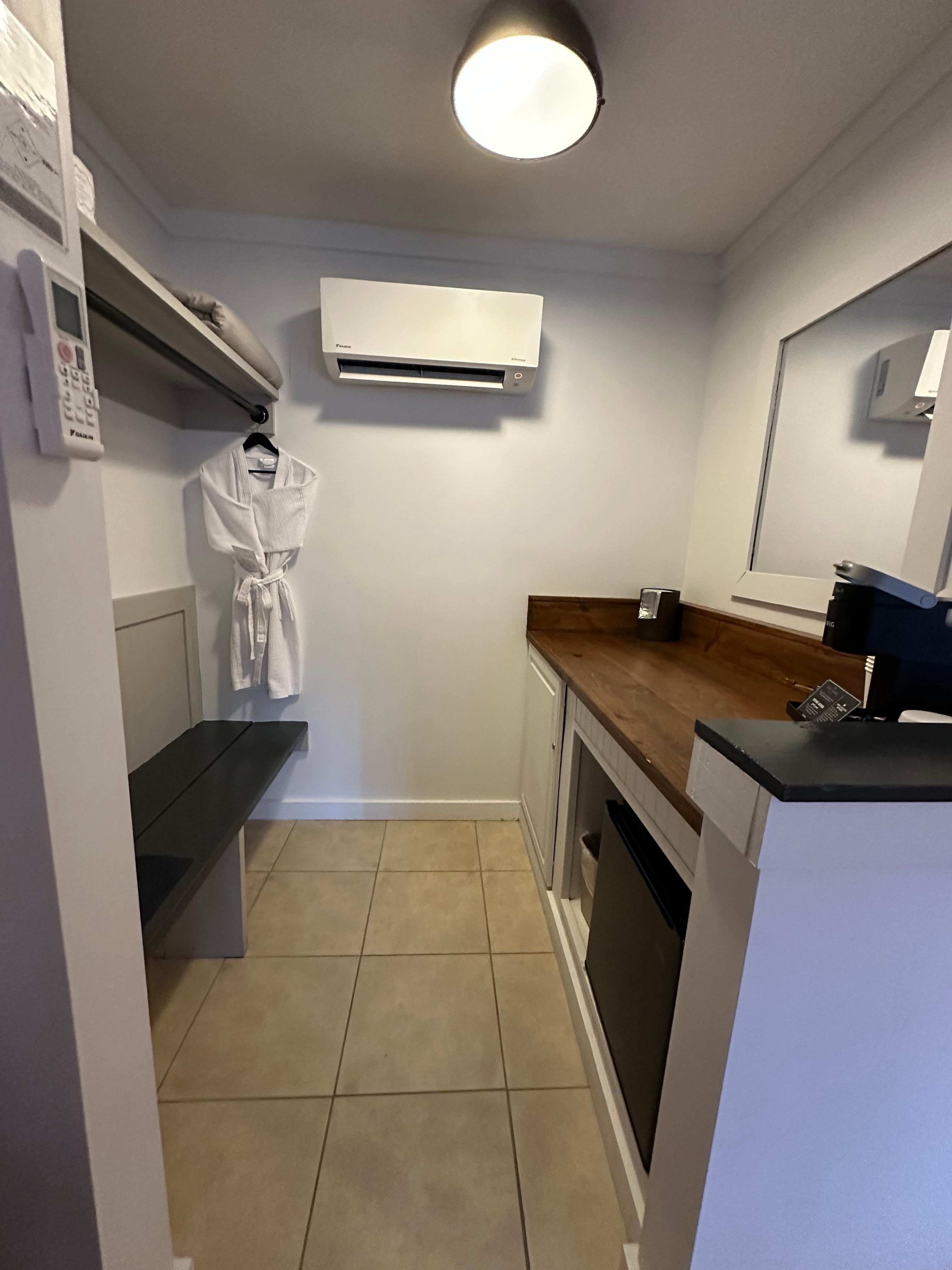 Easy check in & beautiful…very clean room & bathroom. Refrigerator & area to fix food, or to hold extra vacation stuff etc. it’s an open closet as well with a bench. I’ve included photos.