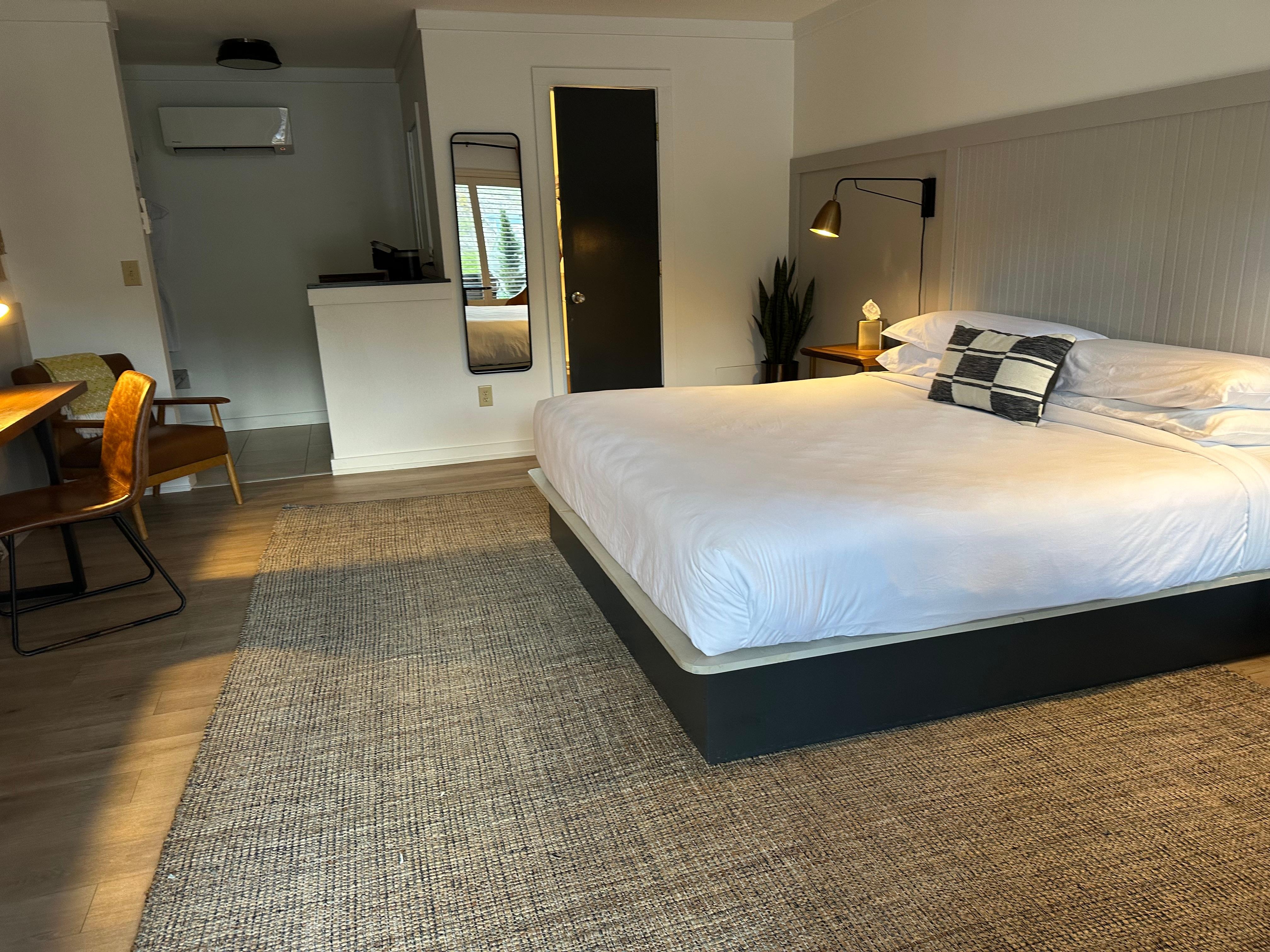 Absolutely my favorite small remodeled hotel. I loved it. There is a pantry bldg that offers free snacks, microwave & tables.The Ice house had Ice machine & W/D & has baskets with a variety of supplies if needed. Entry only by your access code. Very thoughtful added touch. The rooms don’t have a microwave, but there are microwaves in both of building at each end of the run of rooms we were in. Very convenient @ honestly keeps the sometimes strong orders out @ for safety too. Found out at checkout the section we stayed in is getting full remodel too. It truly looks like it was recently remodeled. The other run of rooms/building is being fully remodeled now. The rooms sit up on the next level of land behind where you check in. A couple 100 feet up.. not far.. but where you check in is a restaurant & bar as well as an area to sit/relax & have a drink/light snacks. In the 2 long run of buildings below rooms are a few food places. Besides the high end restaurant there’s a Mexican restaurant, pizza place & at the very end of the other building is a great place to get breakfast. Big portions & good food. Parts of it is also getting redone so not sure what other businesses are there. Very convenient when staying there,