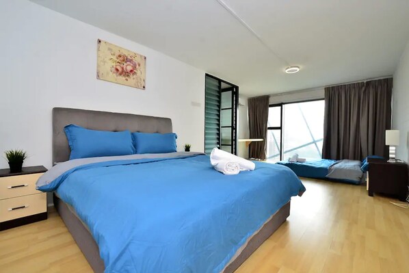 spacious enough loft type apartment to fit up to 5 adults - 2 double beds on the loft area, and a sofa bed on the ground level. Overall stay was ok, as we are familiar with the area, have a few restaurants in the Empire compound. It would make the stay more comfortable if the owner put a proper dining table and chairs, as its quite uncomfortable to be sitting on the floor for a meal or get some work done. THere was a side table on the loft area, but there is no chair at least for us to be able to use the table as should be. the aircon location at the loft area was hidden so can only cool the window side of the area, so maybe a fan or air circulator can help to cool the side closer to the stairs. The double beds were comfortable , but the sofa bed was a bit too soft to sit or lie on. Wifi was good but not much choices to watch on TV. Overall it was still a pleasant stay and instructions for check in were clear.